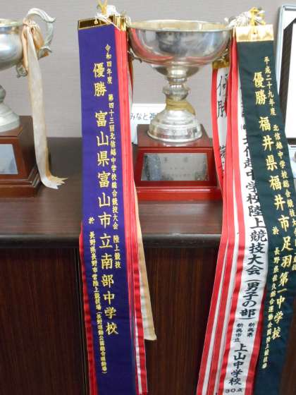 今年度行われた第43回北信越中学校総合競技大会 陸上競技で、本校陸上競技部が男子総合優勝したことを記念し、スポーツ・文化後援会でペナントを作っていただきました。濃い紫の生地に金色の文字で学校名等が入ったペナントです。陸上競技部の輝かしい栄誉が北信越の歴史に記されました。ありがとうございました。