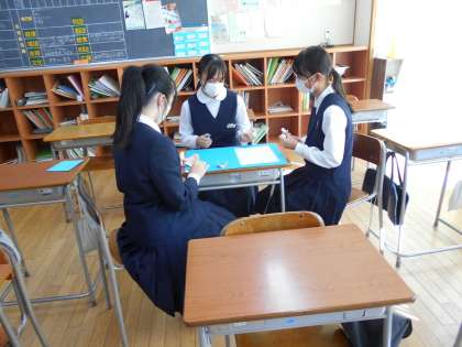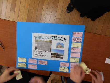 一人一人の思いを書いた付箋は、教室前廊下に掲示予定です。互いの意見を見ることで、さらに平和に対する思いを深めていけたら・・・と思います。