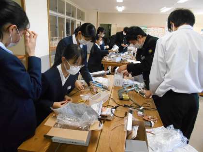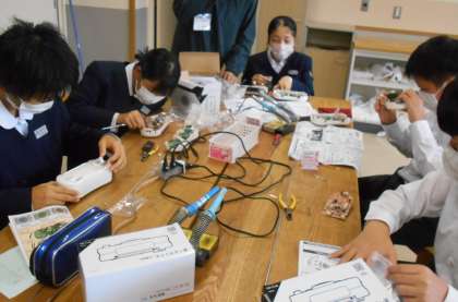 技術の授業では、リチウム電池やLED基板を取り付けて、本体の完成へと進めました。