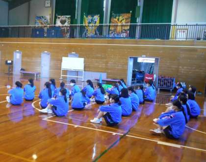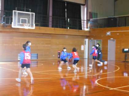 女子保健体育の授業では、3対3での攻守の練習のやり方を確認してから、それぞれグループに分かれて練習をしました。