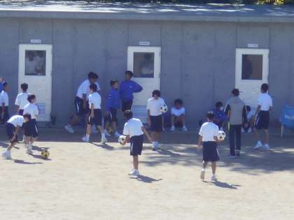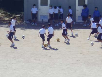 男子保健体育の授業では、サッカーの1対1のドリブル練習を行いました。少しずつ上手になっています。