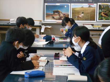 美術の授業は、絵画鑑賞の時間でした。アンリー・ルソーやアンドリュー・ワイエスの絵画を見て、作品の物語を想像し、グループ内で意見を伝え合いました。