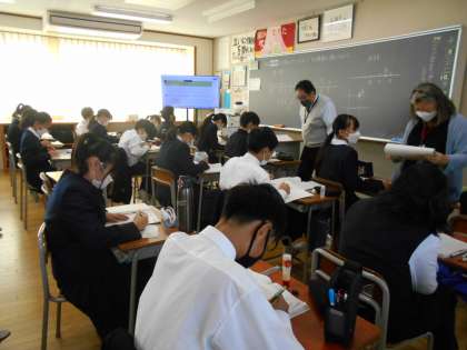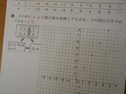 数学の授業では、比例のグラフをかいて、その特徴を考えるために、まず表を読み取って、点を打つことから始めました。