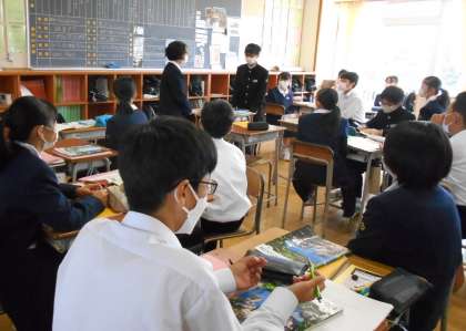 英語の授業では、許可を求めたり依頼したりする表現を勉強し、本文の音読練習の後、発表する時間もありました。発表者にからだをしっかり向けて聴く姿勢が、とてもすばらしかったです。