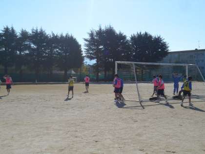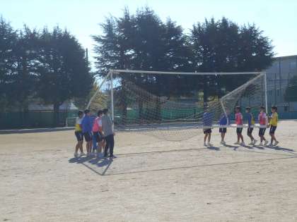 保健体育の授業では、女子はバスケットボール、男子はサッカーでした。今日はサッカーゴールを出して練習をしました。