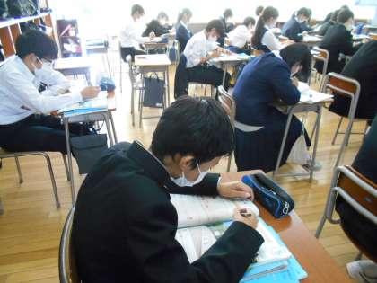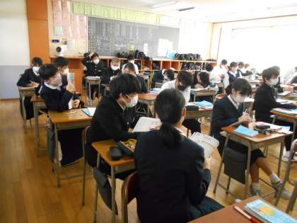 英語の授業では、リスニングに取り組んでいました。聞く力は、練習の積み重ねで培われます。家でもやってみるとよいですね。