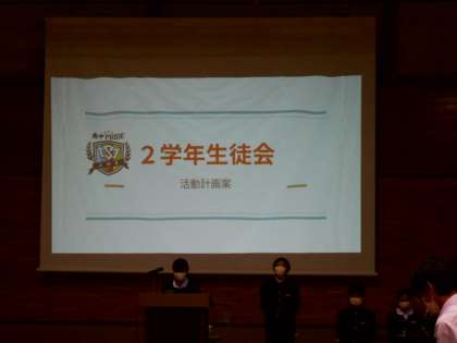 生徒総会の中で、2学年生徒会の活動計画を紹介しました。これまでの活動を振り返り、学年生徒会や書記会等のメンバーがたくさんの取組を考えてくれました。それぞれの活動を2学年全員で実践し、より素敵な学年を創り上げていけるといいです。