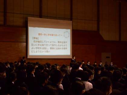 5、6限に生徒総会を行い、生徒会執行部や各専門委員長から後期活動計画案の説明がありました。執行部の活動テーマ「開花〜手と手を取り合って〜」のもと、先輩方からの伝統を受け継ぎつつ、新しい試みも提案されました。いろいろと細かいところを検討・改善していくことも出てくると思いますが、内容をブラッシュアップしながら、南中の「新しい伝統」をつくってくれることを願っています。各委員会の活動テーマは以下の通りです。