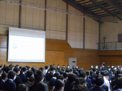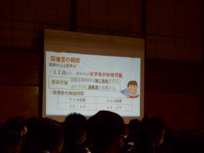 これまで資料を配布していましたが、今回は、学級討議の段階からChromebookを使って活動計画案を共有し、今日の生徒総会も、大きなスクリーンに映し出されたスライドを全校で見ながら進めました。より見やすいスライドになるように、文字の大きさやレイアウト、色彩を工夫したり、イラストを取り入れたりしていました。また、事前に生徒の皆さんから寄せられた質問・意見・提案を整理して説明している委員長もいました。説明する側も、聞く側も、立派な態度で臨んでいました。
