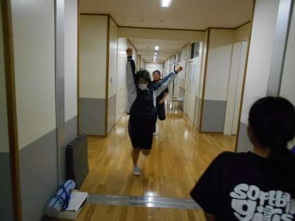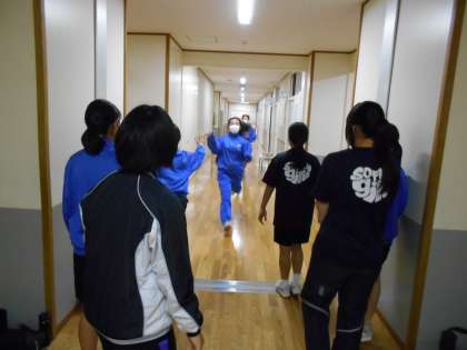 ソフトボール部は、廊下を使ってリレーをしていました。笑顔があふれ、チームワークのよさが見られました。