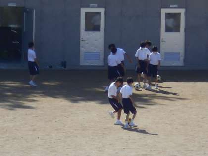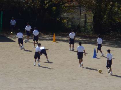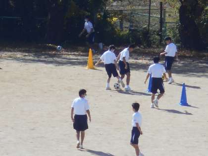 男子保健体育の授業ではサッカーに取り組んでいます。今日はドリブルをしている相手からボールを奪い取る練習をしていました。うまくできたでしょうか。