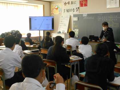 数学の授業では、比例のグラフをかくことで、点の集まりが直線になっていることに気付くことができました。