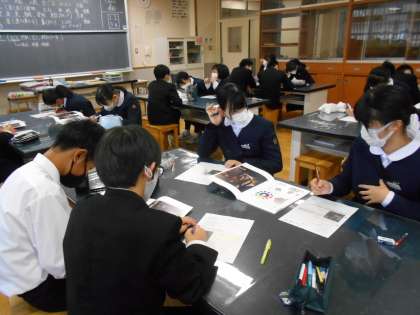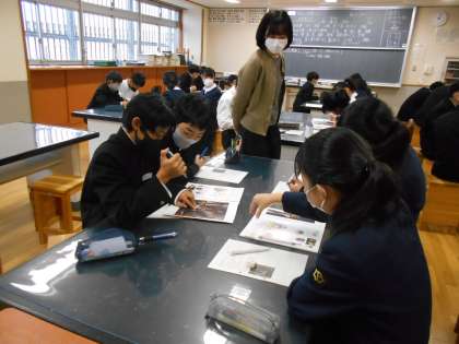 美術の授業では、「作品の謎解きをしよう」ということで、いつ、だれが、何をしているところを描いているのかを、グループごとに意見交換しました。