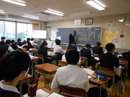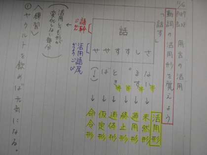国語の授業では、用言の活用の学習に入り、今日は動詞の活用形を勉強しました。