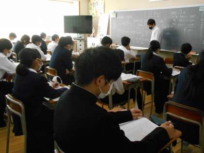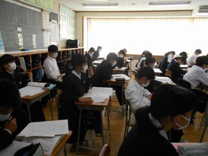 英語の授業では、中教研学力調査が返され、振り返りをしました。問題に答えるこつもつかんでいきましょう。