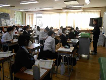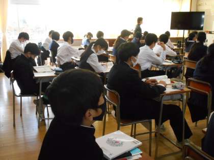 数学の授業では、反比例の式を求めることに取り組みました。先生の話を真剣に聞く姿が光りました。