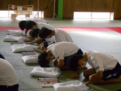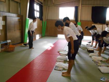 男子保健体育の授業は、柔道に入りました。今日はその1回目で、礼法からスタートしました。