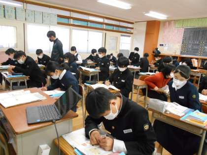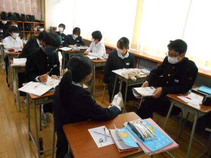 英語の授業では、リスニング力の向上を図る授業でした。聞き取れた内容をシェアした後で、再度聞くことにより、より注意して聞くことができます。