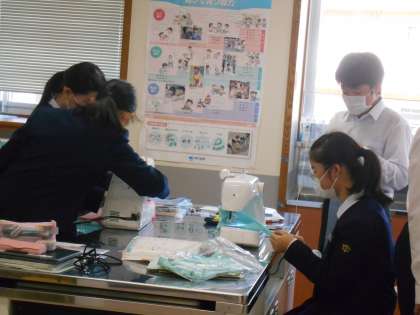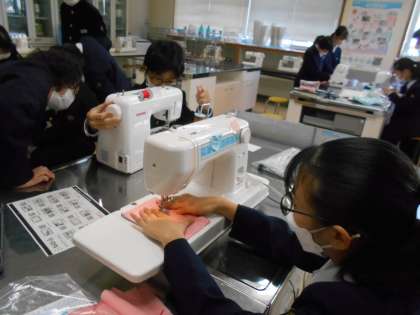 家庭科の授業では、ミシンを使ってエコバックを制作をしています。糸の通し方や上糸と下糸の調整の仕方等、教え合いながら進めました。