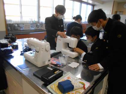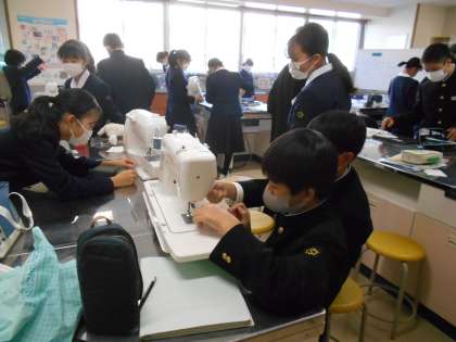 家庭科の授業では、エコバック作りに向けて、ミシンの使い方を確認していました。分からないときは、同じ班員同士で教え合っていました。