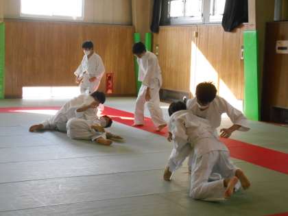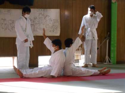 男子保健体育の柔道の様子です。今日は寝技で一本とる練習をしていました。
