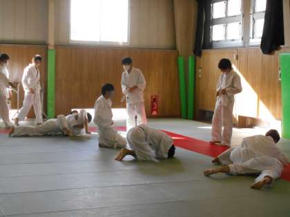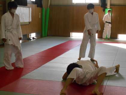 男子保健体育の柔道の様子です。今日は寝技で一本とる練習をしていました。