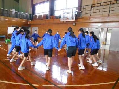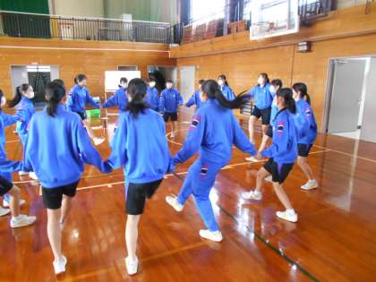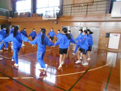 女子保健体育の授業は、フォークダンスに取り組んでいました。マイムマイムやオクラホマミクサー(ミキサー)に取り組んでいます。