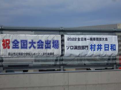 1年生の村井日和さんが、一輪車競技で全国大会に出場します。スポーツ・文化後援会で横断幕を作っていただきました。スポーツ・文化後援会の皆様、ありがとうございます。これまでの練習を十分に発揮できるように頑張ってきてください。