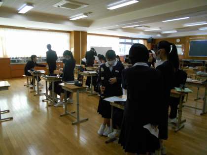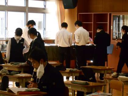 音楽の授業では、アルトリコーダーに取り組み、互いに運指を確認しながら進めていました。
