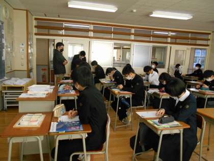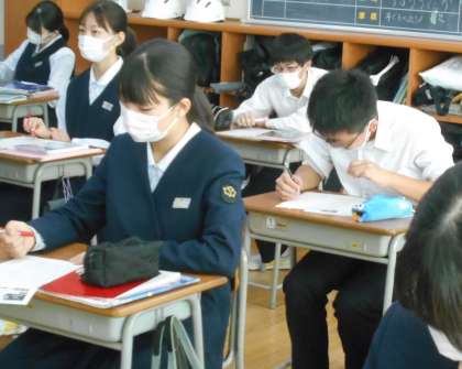 英語の授業では、これまでの学習をワークシートを使って復習しました。つまずいたところは、質問等して理解しながら進められたでしょうか。
