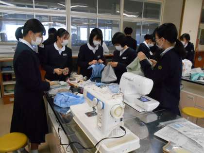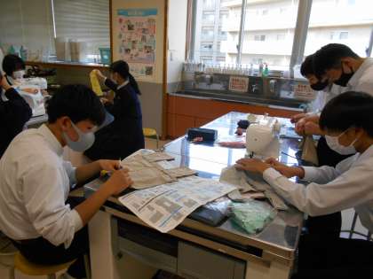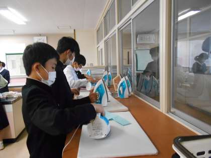家庭科の授業では、エコバッグ作りに取り組んでいます。ミシンで縫う、アイロンをかける、ボタンを付ける。いろいろな工程で裁縫の技術が身に付いていきます。完成が楽しみです。