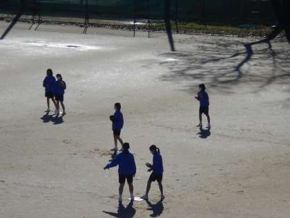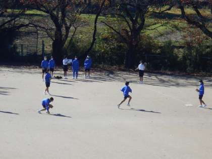 女子保健体育の授業では、グループに分かれ、打たれたボールをキャッチ、打った人は塁へ走る練習をしていました。今日はいつもより暖かく、和やかな様子で活動していました。