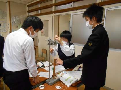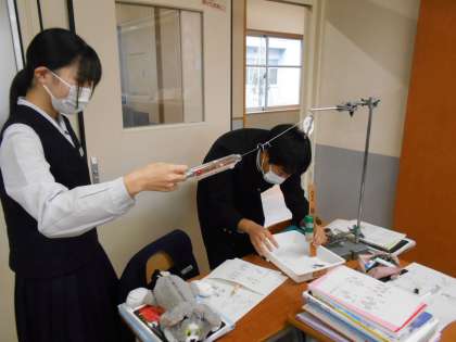 理科の授業では、おもりを引き上げる高さやおもりにはたらく重力、手が加える力等を計り、仕事の原理が成り立つことを確かめました。
