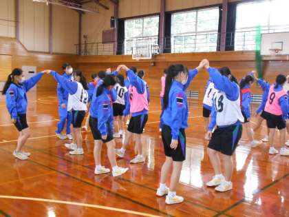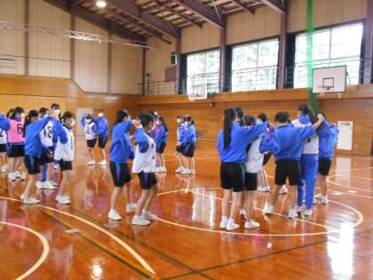 女子保健体育の授業では、アメリカのフォークダンス「オクラホマミクサー(ミキサー)」に取り組みました。ダンスをするとみんな笑顔になり、見ている方もうれしくなります。