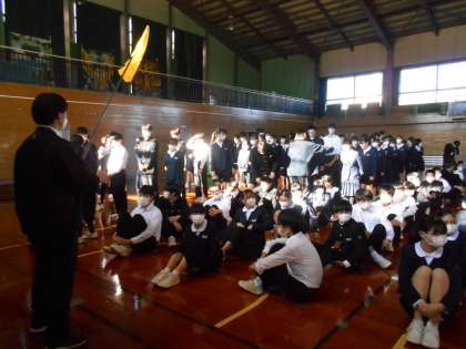 本日の避難訓練は、いつ火災報知器が鳴るかを知らせないという形で行いました。生徒のみなさんは、清掃時間中に火災報知器が鳴るとその場に座り、放送を聞いて、落ち着いて、静かに移動しており、消防署員の方からほめていただきました。