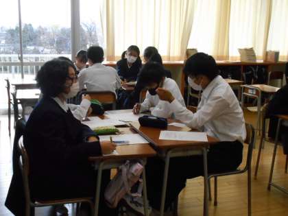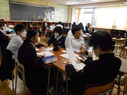 家庭科の授業では、グループでテストの解き直しをしていました。一人で見直すよりも、分からなかったところを理解しやすかったのではないでしょうか。