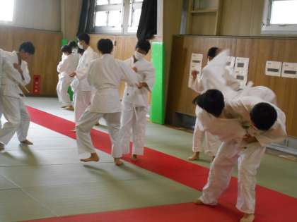 男子保健体育の授業は柔道です。今日は立ち技に取り組みました。1つでも2つでも技を習得して、卒業しましょう。