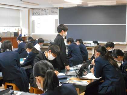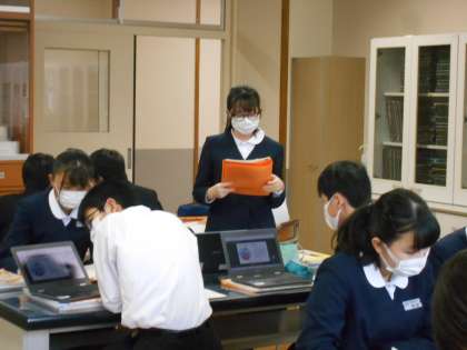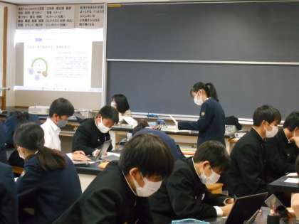 美術の授業では、執行部や専門委員会のオリジナルロゴマークのプレゼンテーションを行っていました。いろいろなアイディアの裏に、しっかり意図があることが分かりました。
