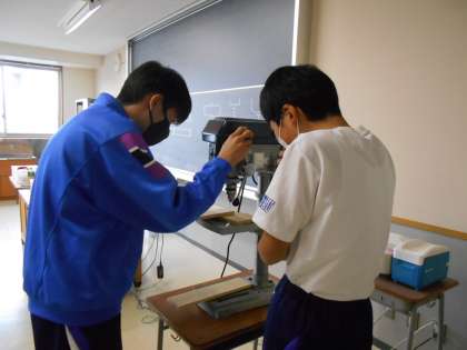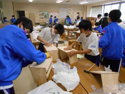 技術の授業で作っている木製本立が完成間近です。組み立て終わり、紙やすりで表面の仕上げをしている人もいました。