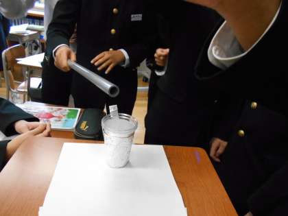 理科の授業では、静電気を体感する実験をしました。摩擦で起こした静電気を集め、4〜5人が手をつないで、いざ!という実験でした。どんなふうに感じるのかどきどきしながら手を伸ばしていました。