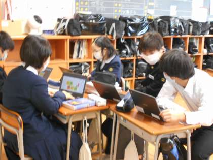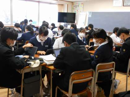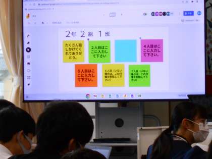 NTの時間に、クロームブックを使って互いに「ありがとうメッセージ」を贈り合いました。2学年では、書記会企画の「ありがとうメッセージ」の取組を何度か実施していますが、今日は生徒会主催の企画でした。互いに使い方を確認しながらメッセージを入力している生徒もいました。