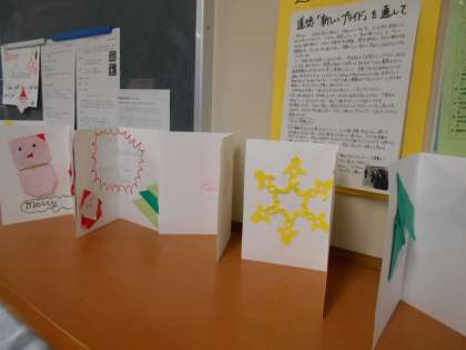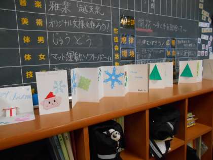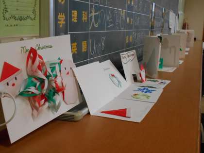 英語の授業で制作したクリスマスカードが並べられています。折り紙で切り絵をしたり、サンタを作ったりと、思い思いの楽しいカードが並び、教室が楽しく、明るい雰囲気になっています。