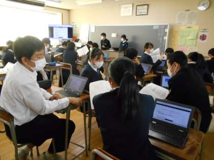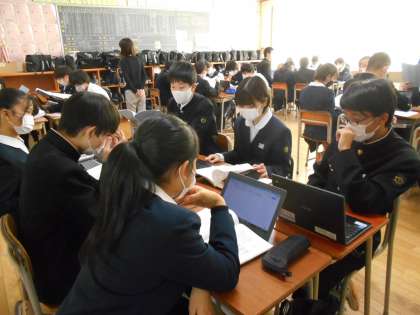 「生徒約束の意義」について、他学年の意見も参考にしながら、学級会の場で意見交換をした後、生活ノートを見ながら、具体的に「生徒約束」の見直しをました。靴下の色、靴の色、髪型等、いろいろな視点から意見が出ました。