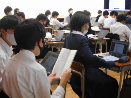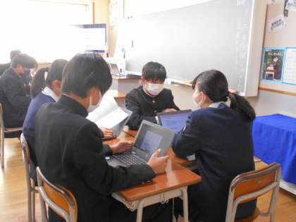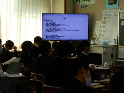 生徒約束について学級討議を行いました。生徒約束の意義について事前に出し合った意見を互いに確認しながら班で話し合いを進めていました。どのような生徒約束があるのか、実際に生活ノートで確認している生徒もいました。