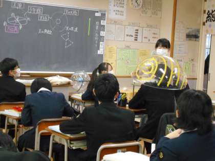 理科の授業では、太陽の動きを観察する方法を勉強しました。太陽の道筋をテープで貼った半円球をかぶって、確認できるようです。