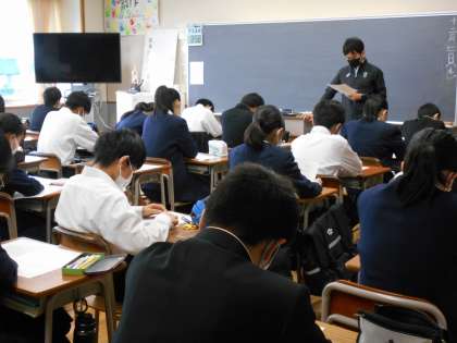 人権週間の取組の一つとして、今週のNTの時間に、人権作文を読んで感じたことを書き留めています。担任の先生が読み上げられる作文を真剣に聴いていました。今日の作文は「かけがえのないもの」というタイトルで、深く考えさせられたようです。