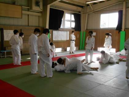男子保健体育の授業では、柔道の寝技の練習に入りました。背中を合わせたところからスタートし、寝技に持ち込む。うまくできたでしょうか。