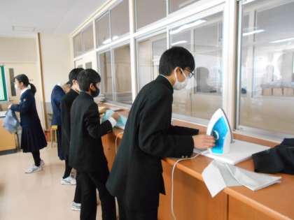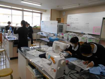 家庭科の授業では、エコバック作りに取り組んでおり、縫いしろのアイロンがけ、ミシンの準備等、それぞれ段階に合わせて進めました。