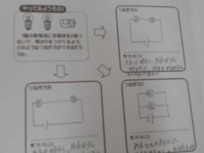 理科の寿y号では、回路を作ってみようという課題に取り組みました。直列回路、並列回路を記号を使って書きました。