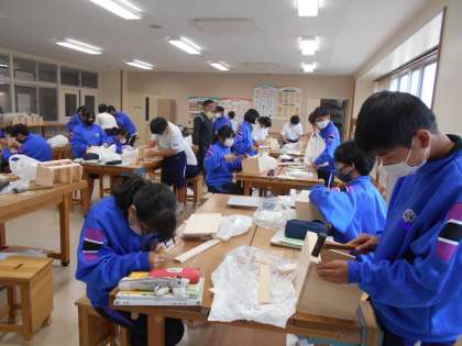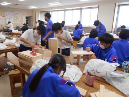 技術で取り組んでいる木製本立て作りの様子です。だいぶ完成に近づきました。